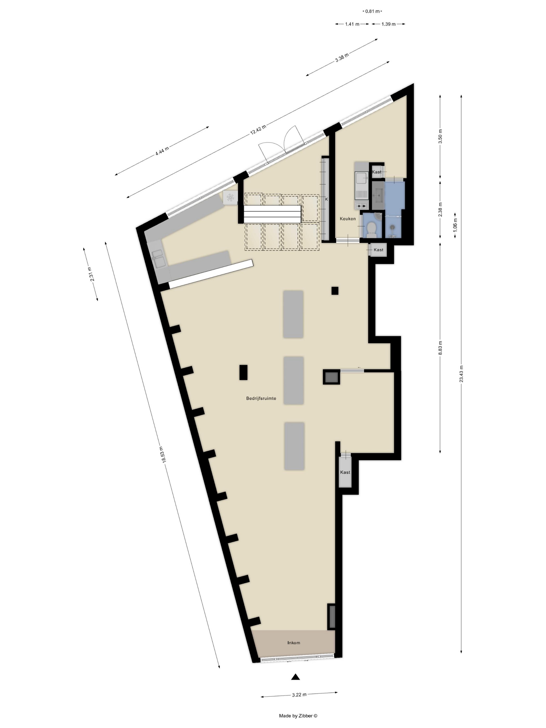 Indeling; Ruim handelsgelijkvloers (vrij in te richten), bureelruimte, keuken, sanitaire ruimte en toilet.